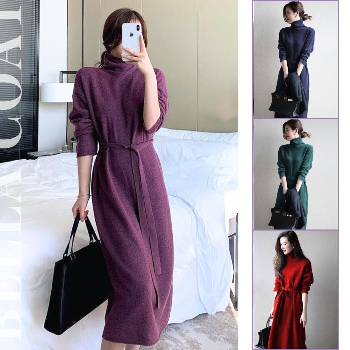 เดรสไหมพรมยาวคอเต่า ดีไซน์เรียบสวยมาพร้อมสายคาดเอว